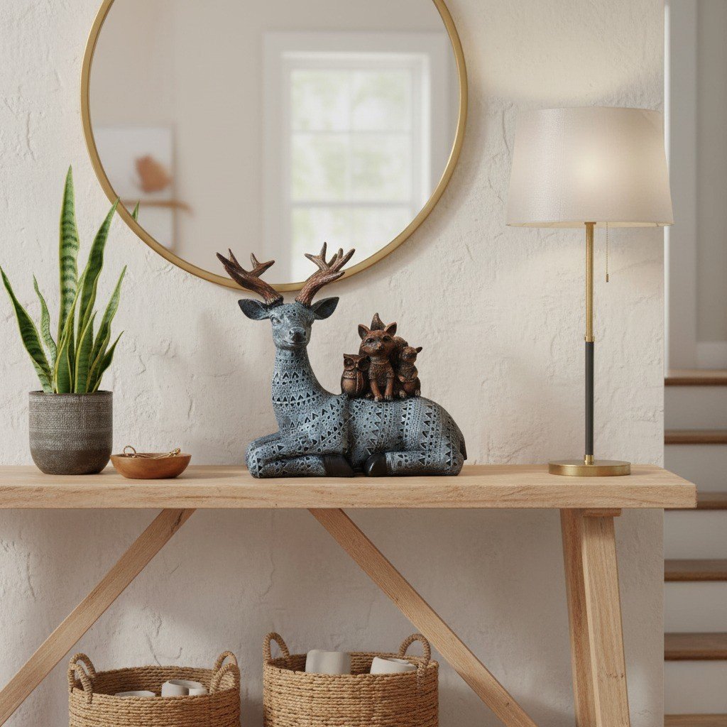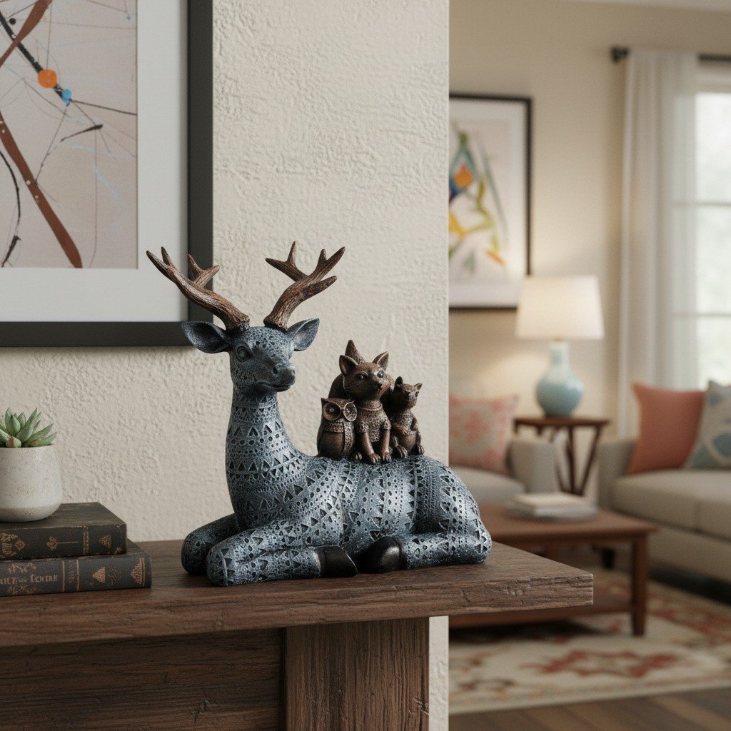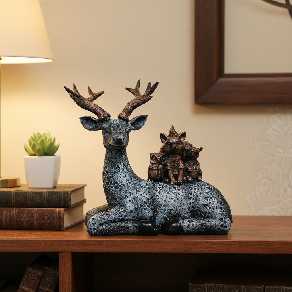 Elevate your home decor with this exquisitely crafted Artisanal Deer Stag Statue, a true embodiment of woodland artistry and elegance. This stunning figurine captures a peaceful moment in nature, featuring a graceful deer stag with an impressive rack of antlers, carrying both a cheerful squirrel and a small rabbit/hare on its back. The main deer body is finished in a striking black and silver color palette, adorned with an intricate geometric pattern that gives it a sophisticated, contemporary, and ethnic or folk-art flair. More than just a statue, this piece is a meticulously detailed showstopper, designed to become the focal point of any room. It?s perfect for adding a touch of rustic charm or bohemian chic to your living room, bedroom, office, or cabin decor. Place it on a fireplace mantel, a console table, or a large bookshelf to instantly refresh your space. Features: – Material (Confirm): High-Quality Polyresin or Resin Compound – Color: Black and Silver with Copper/Bronze Accents on Antlers and Small Animals – Style: Textured, Patterned, Woodland, Wildlife, Rustic-Modern – Perfect as a unique housewarming gift, holiday present, or a special treat for animal figurine collectors. Bring the tranquility and nobility of the forest into your home with this one-of-a-kind decorative sculpture.