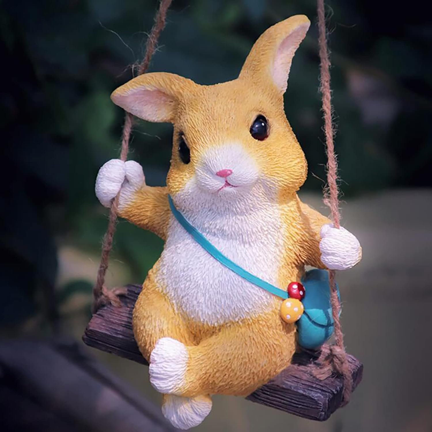 Adorable Bunny Rabbit on a Swing Statue – Whimsical Hanging Garden Figurine – Resin Indoor/Outdoor Tree or Patio Decor